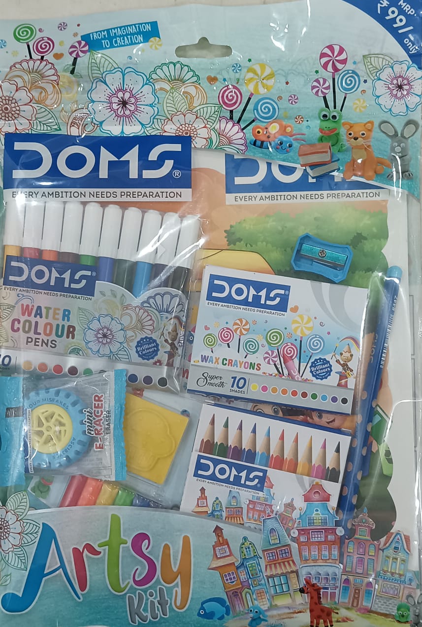 - Doms Artsy kit | Doms Painting kit contains – 1 coloring book, 1 set color pencil pack (10 shades ), 1 wax crayon pack (10 shades), 1 water colour pen pack (6 shades), 1 modelling clay pack (6 shades), 1 pencil, 1 pencil sharpener, 1 eraser