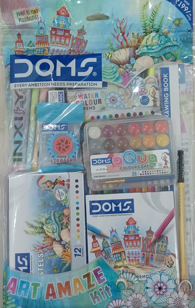 - Doms Painting kit contains -1 drawing book, 1 set color pencil pack (12 shades ), 1 set oil pastel (12 shades ), 1 set water colour pens (12 shades ), 1 Set water colour cake, 1 ball point pen pack, 1 pencil, 1 eraser, 1 pencil sharpener